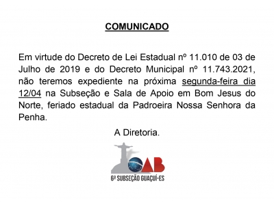 Comunicado sobre o Expediente dia 12 de abril de 2021